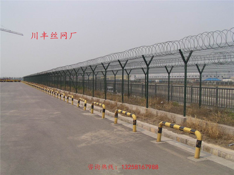 機場、監(jiān)獄護欄網(wǎng)又稱作“Y型安全防御護網(wǎng)”,是由V型支架立柱,加強型焊接片網(wǎng),安全防盜連接件和不銹鋼刀片刺網(wǎng)組成強度和安全防御性級別很高。