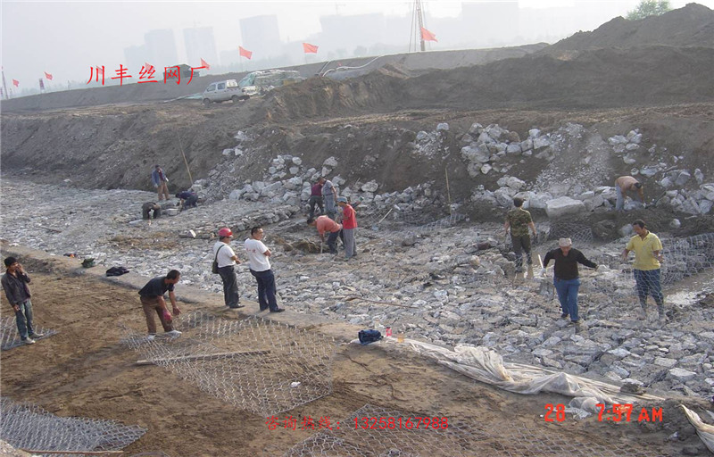 雷諾護(hù)墊是厚度在0.17-0.5m的網(wǎng)箱結(jié)構(gòu),在現(xiàn)場用于裝填石頭。主要用作河道、岸坡、路基邊坡護(hù)坡結(jié)構(gòu)。既可防止河岸遭水流、風(fēng)浪侵襲而破壞,又實現(xiàn)了水體與坡下土體間的自然對流交換功能,達(dá)到生態(tài)平衡。坡上植綠可增添景觀、綠化效果。